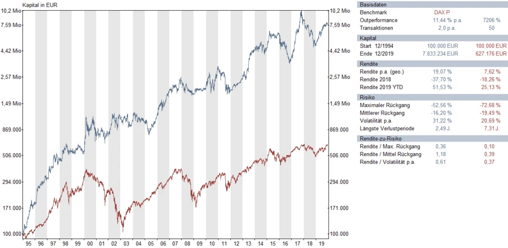 Ende des letzten Jahres stand der Chiphersteller Dialog Semiconductor ganz oben auf der TSI-Wunschliste mit einem TSI-Wert von glatten 100 Prozent. Das Ergebnis im 2019 (Stand: 20. Dezember): +105,4 Prozent. Freilich klappt es so gut nicht in jedem Jahr. Der 2018er-Favorit Wacker Chemie ging beispielsweise nach hinten los. Aber die Gesamtperformance dieses einfachen Prinzips hat seit 1995 zu einer Outperformance des DAX um elf Prozentpunkte geführt. Die Grafik zeigt die Kapitalentwicklung des Systems: