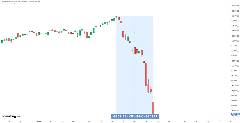 Ähnliches Bild in Italien, dem derzeit in Europa am stärksten von der Coronavirus-Epidemie getroffenen Land. Der Mailänder Leitindex MIB verliert zur Stunde über 2.000 Punkte. Er hat nun ausgehend vom Hoch annähernd 40 Prozent seines Wertes eingebüßt – innerhalb von nur 16 Handelstagen.
