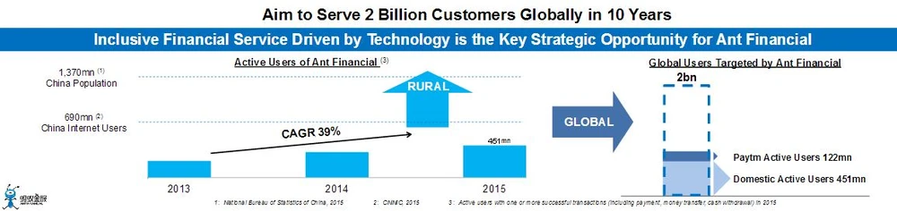 Ant Financial bietet annähernd alles, was die Branche der Finanzdienstleistungen hergibt: Zahlungsdienst, Geldtransfer, Vermögensberatung, Versicherungsmakler, Kredite und Kreditauskunft. Die Anzahl der Nutzer wächst jedes Jahr um durchschnittlich 39 Prozent. Bereits 2015 versorgte Ant Financial 451 Millionen Menschen mit solchen Finanzdienstleistungen. Ziel ist es, weltweit zwei Milliarden Menschen auf die Plattformen zu bekommen.