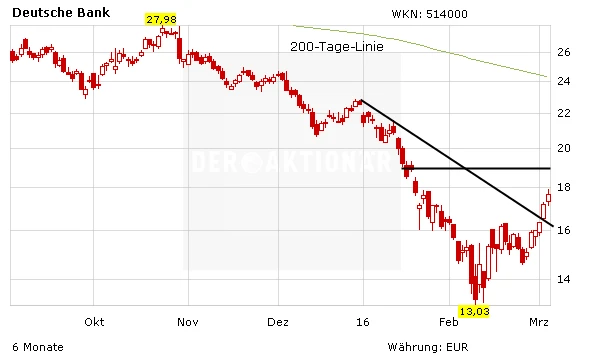 Die Erholungsrallye der Deutschen-Bank-Aktie setzt sich am Freitag fort. Im frühen Handel notiert der Titel ein Prozent im Plus auf 17,81 Euro. Trader, die der AKTIONÄR-Empfehlung gefolgt sind, liegen längst zweistellig im Plus.