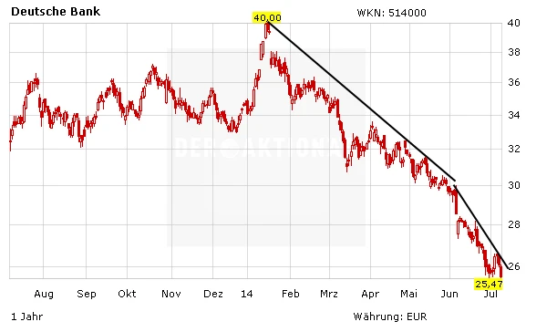 Auch DER AKTIONÄR hält die Deutsche-Bank-Aktie auf dem aktuellen Niveau für deutlich zu günstig bewertet. Der faire Wert liegt bei 35 Euro. Allerdings sind nach wie vor die Rechtsrisiken das bestimmende Thema bei der Deutschen Bank. Eine kurzfristige Entspannung ist hier nicht zu erwarten. Sollte die Aktie das Zwischentief bei 25,465 Euro unterschreiten und auch unter die runde Marke von 25 Euro fallen, droht ein Rücksetzer in den Bereich von 22 Euro, dem Jahrestief von 2011. Investierte Anleger sollten die Aktie halten und den Stopp bei 20,50 Euro setzen.