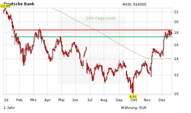 Die Aktie der Deutschen Bank kann bereits im vorbörslichen Handel deutlich zulegen und steht kurz vor dem Sprung über den Widerstand bei 18,70 Euro. Laut eines Top-Investors könne allerdings auch die jetzige Zahlung für die Deutsche Bank „gefährlich“ werden, so das Handelsblatt. Entscheiden wird sein, über welchen Zeitraum die Kundenentschädigungen in Höhe von 4,10 Milliarden Dollar gezahlt werden müssen. Zudem stehen noch andere, große Rechtsstreitigkeiten wie zum Beispiel in Russland aus. Die Aktie eignet sich weiterhin nur für Trader.
