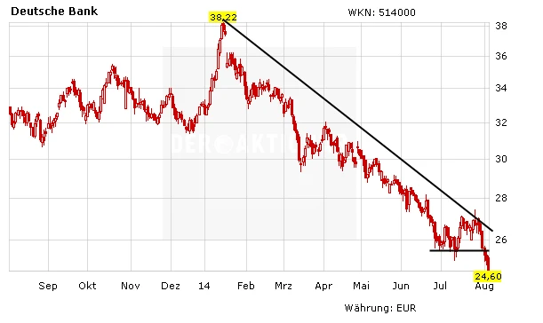 Die Aktie der Deutschen Bank fällt am Mittag um 1,8 Prozent auf 24,63 Euro. Neue Meldungen gibt es keine. Laut Händlern in Frankfurt haben die Anleger offenbar kalte Füße bekommen, nachdem das Papier auf ein neues Tief seit Anfang August 2012 gefallen ist. Aus technischer Sicht ist das Bild der Aktie mit diesem erneuten Verkaufssignal deutlich angeschlagen.