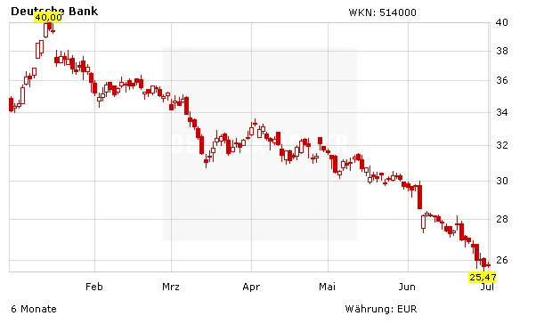 In Frankfurt schloss die Deutsche Bank bei 25,85 Euro und damit in etwa auf dem Niveau des Vortages. Bemerkenswert ist, dass die Aktie nach dem Fall unter die wichtige Unterstützung bei 26 Euro ihren Abwärtstrend nicht noch einmal beschleunigt hat. So besteht die Hoffnung, dass der DAX-Wert diese Marke wieder zurückerobert.