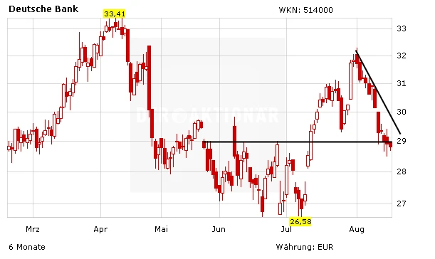 Charttechnisch bleibt die Situation bei der Deutschen Bank angespannt. Noch hält die Unterstützung im Bereich 29 Euro. Sollte die Marke nicht halten, könnte es schnell in Richtung 28 Euro abwärts gehen. Als nächster Widerstand wartet der kurzfristige Abwärtstrend im Bereich 29,80 Euro. Die nächsten Widerstände sind bei 31 und 32 Euro auszumachen.