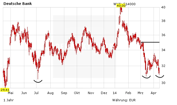 Im Rahmen dieser Formation müsste die Deutsche Bank allerdings das Hoch von Anfang März in Angriff nehmen, das bei etwa 35 Euro liegt. Die Chance darauf besteht allemal, hat der Kurs schon mehrfach bei 31 Euro wieder nach oben gedreht.