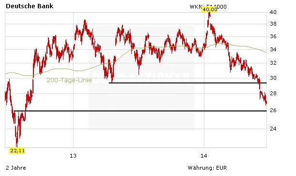 Sollte dieses Unterstützungsniveau nicht halten, könnte sich der Abwärtstrend noch einmal beschleunigen. Als nächste Zielzone käme dann der Bereich um das 2012er-Tief bei 22,11 Euro in Betracht. Zur Erinnerung: Das Mehrjahrestief der Deutschen Bank liegt bei 20,79 Euro.