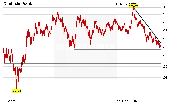 Wird das Zwischentief bei 29,41 Euro unterschritten, müssen sich die Aktionäre der Bank auf weitere Kursverluste einstellen. Die nächsten markanten Unterstützungen liegen bei 26,61 Euro (Juni 2012) und dann im Bereich von 25 Euro.