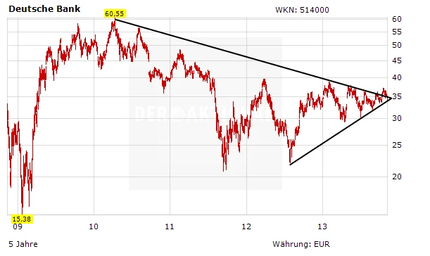 Anleger sollten die charttechnische Situation bei der Deutschen Bank weiter genau im Blick haben. Die Aktie notiert derzeit knapp oberhalb des seit Mitte 2012 gültigen Aufwärtstrends. Sollte sie nachhaltig darunter rutschen, dürfte die Aktie weiter unter Druck geraten. Vor Kurzem hatte es noch so ausgesehen, als ob die Aktie aus ihrer Keilformation ausbrechen und den seit Anfang 2011 gültigen Abwärtstrend durchbrechen würde. Doch der Ausbruch dauerte nur kurz und erwies sich somit als nicht nachhaltig. Ein starkes Kaufsignal blieb aus.