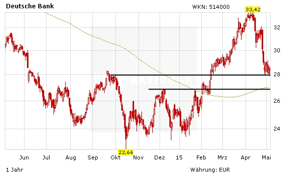 Nach unten sichert wie gesagt die Unterstützung bei 28 Euro ab. Tunlichst vermeiden sollte die Deutsche Bank einen Bruch der 27-Euro-Marke. Neben einer horizontalen Unterstützung verläuft dort die 200-Tage-Linie. Sollte die Aktie darunter fallen, wäre dies ein massives Verkaufssignal.