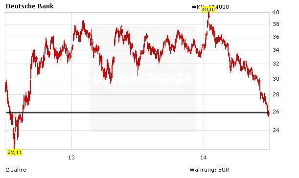 Jetzt, wo sich die Lage in Bulgarien wieder entspannt, beruhigen sich auch die Kurse der europäischen Bank-Aktien wieder. Die Deutsche Bank legt am Dienstagmittag 0,5 Prozent auf 25,82 Euro zu. Jetzt ist es zunächst wichtig, dass die Aktie die 26-Euro-Marke zurückerobert. Sollte die Marke von 26 Euro nachhaltig unterschritten werden, kann es richtig ungemütlich werden. Wer bei 26 Euro eingestiegen ist, sollte sich mit einem Stopp bei 20,50 Euro absichern.