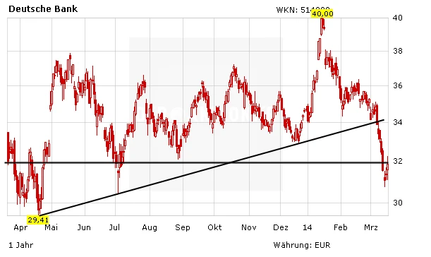 Die Krimkrise hat ihren Schrecken – vorerst jedenfalls – verloren. Die Anleger haben wieder Mut zum Risiko und greifen bei Bank-Aktien zu. Die Aktie der Deutschen Bank steigt am Mittwoch wieder über die Marke von 32 Euro. Die charttechnische Situation verbessert sich damit zusehends.
