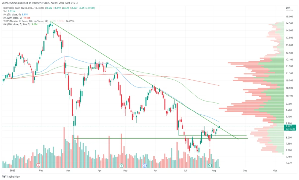 Nach dem Sprung über den Widerstand am März-Tief bei 8,16 Euro hat die Aktie der Deutschen Bank wieder an Fahrt gewonnen. Peu à peu kämpfte sie sich über die Hürde am Zwischentief bei 8,29 Euro zurück und stieg nun sogar über die mittelfristige Abwärtstrendlinie bei aktuell 8,62 Euro. Schließt der Titel heute über dieser Marke, wird ein Kaufsignal ausgelöst.
