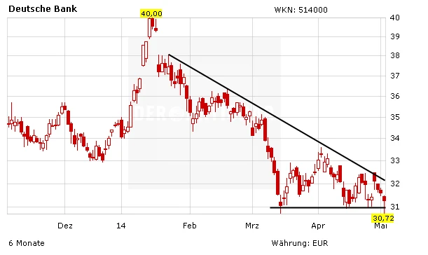 Nach dem Bruch der 31-Euro-Marke fiel die Aktie am Montag zwischenzeitlich auf 30,72 Euro. Zur Erinnerung: DER AKTIONÄR hat seine Kaufempfehlung mit einem Stoppkurs bei 30,50 Euro abgesichert. Doch mit dem Comeback am deutschen Aktienmarkt konnte sich auch die Deutsche Bank zum Handelsende hin wieder über die 31-Euro-Marke retten (Schlusskurs auf Xetra: 31,27 Euro).