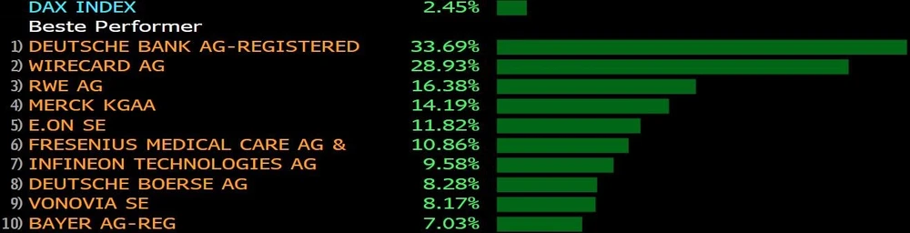 Am Donnerstag zieht mit der Deutschen Bank jedoch ausgerechnet eins der größten Sorgenkinder der letzten Jahre an Wirecard vorbei. Mit einem Kursplus von 33,7 Prozent seit Jahresbeginn verweist die Großbank die Papiere des Zahlungsabwicklers auf Rang 2.
