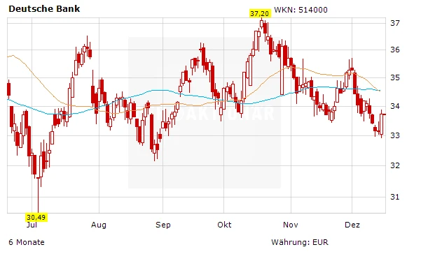 Aufgrund gesunkener Gewinnprognosen für 2014 ist das KGV der Deutschen Bank mittlerweile von 8 auf 9 gestiegen. Dennoch ist das Papier weiterhin eine der günstigsten Bankaktien Europas. Aus charttechnischer Sicht wäre die Rückeroberung der 34-Euro-Marke und der 38- und 90-Tage-Linie wichtig. Am Montag machte das Papier bereits mit einem Plus von 1,6 Prozent auf 33,66 Euro den Anfang.
