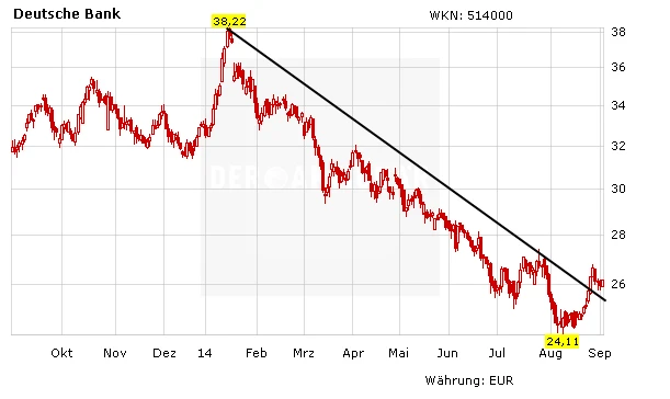 Die Aktie der Deutschen Bank legt am Dienstag 0,8 Prozent auf 26,xx Euro zu. Damit hinkt der Titel zwar dem DAX etwas hinterher, schneidet aber besser ab als der Index der europäischen Bankenwerte.