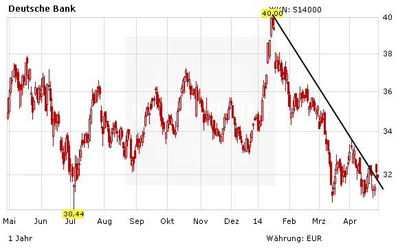 Die Deutsche-Bank-Aktie verliert am Mittwochmittag 0,7 Prozent auf 31,88 Euro. Neben den negativen Studien belastet ein skeptischer Kommentar der Ratingagentur Standard & Poor's, die den Ausblick auf „Negativ“ gesenkt hat. Die Aktie ist auf dem aktuellen Niveau mit einem 2015er-KGV von 7 sehr günstig bewertet. Allerdings dürften weiterhin die Rechtsrisiken den Aktienkurs belasten. Investierte Anleger bleiben dabei und beachten den Stoppkurs bei 30,50 Euro.