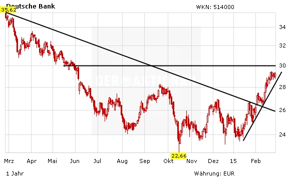 DER AKTIONÄR sieht mehr Potenzial für die Deutsche Bank, nämlich bis 33 Euro. Nachdem sich die Griechenlandproblematik ein paar Monate in die Zukunft verschoben hat, sollte das Sentiment für die Bankenbranche positiv bleiben. Für Fantasie sorgt bei der Deutschen Bank die Aussicht auf eine neue Strategie. Der Vorstand will in den kommenden Wochen bekannt geben, welche Stellschrauben er bei Deutschlands Marktführer drehen will. Gespannt ist die Börse vor allem darauf, wie die Doppelspitze Jain/Fitschen die Kosten senken will. Stopp bei 23 Euro setzen.