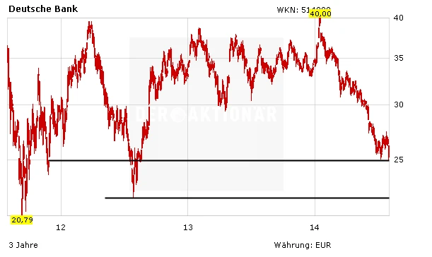 Die Aktie der Deutschen Bank ist am Freitag mit 25 Euro auf ein neues 2-Jahres-Tief gefallen. Sollte der Abwärtstrend hier nicht stoppen, wartet bei 22,11 Euro die nächste Unterstützung. Das 5-Jahres-Tief resultiert vom September 2011 und liegt bei 20,80 Euro.