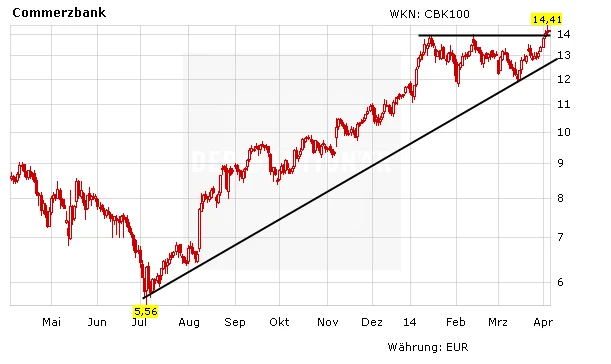 Die Deutsche Bank ist auf dem aktuellen Niveau ein Kauf. Das Kursziel lautet 42 Euro. Die Commerzbank-Aktie ist nur eine Halte-Position mit einem Kursziel von 13 Euro.