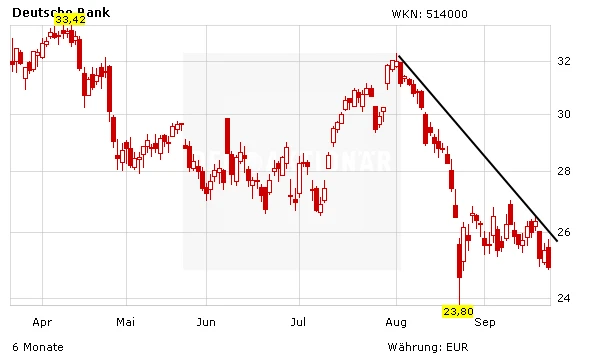 Die Aktie der Deutschen Bank verliert am Dienstagmittag zwei Prozent und rutscht unter die Marke von 25 Euro. Die Verluste sind allerdings nicht auf die Entwicklung im Kirch-Prozess zurückzuführen, sondern auf die allgemeine Marktschwäche. Der DAX verliert am Mittag drei Prozent, in die Tiefe gerissen wird der Index von Volkswagen. Obwohl die Deutsche-Bank-Aktie gegenüber dem Markt Relative Stärke zeigt, signalisiert der Chart klar: Vorsicht. Das 6-Monats-Hoch ist nicht weit entfernt. Derzeit ist die Aktie kein Kauf.