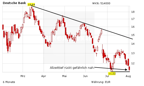 Die Commerzbank-Aktie verliert am Dienstagvormittag acht Prozent auf 5,33 Euro, die Deutsche-Bank-Aktie büßt 3,7 Prozent ein auf 11,37 Euro. Für die Commerzbank-Aktie ist es der tiefste Stand aller Zeiten. Die Deutsche-Bank-Aktie ist nur noch einen Hauch davon entfernt.
