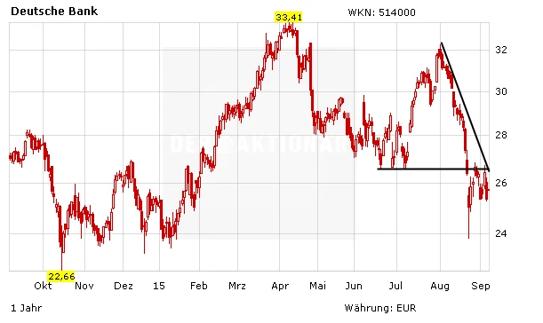 Nachdem die Aktie der Deutschen Bank im Zuge des Crashs vor zwei Wochen ausgestoppt worden ist, können Anleger weiterhin die Füße still halten. Vor einem Neueinstieg sollte zunächst noch eine Bodenbildung abgewartet werden.