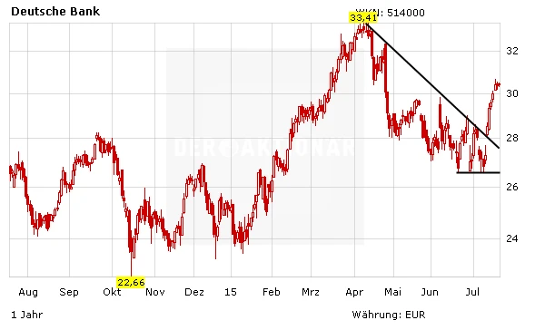 Aktuell gehen die Analysten davon aus, dass die Deutsche Bank im laufenden Jahr insgesamt Einnahmen von 34,1 Milliarden Euro erzielen dürfte. Der bereinigte Gewinn soll sich auf 5,0 Milliarden Euro belaufen (Vorjahr: 4,8 Milliarden Euro), das Reinergebnis auf 2,5 Milliarden Euro (2014: 1,7 Milliarden Euro) beziehungsweise 1,97 Euro je Aktie. Für das kommende Jahr wird mit Erträgen von 34,2 Milliarden Euro gerechnet. Bei einem bereinigten Gewinn von 5,3 Milliarden Euro soll das Nettoergebnis 4,3 Milliarden Euro betragen (2,66 Euro pro Anteilschein). 2017 sollen es dann sogar 5,3 Milliarden Euro (3,64 Euro je Aktie) werden.