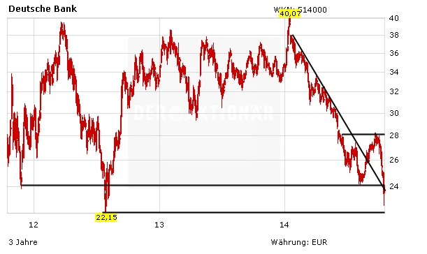Auch DER AKTIONÄR hält die Anteile der Deutschen Bank für klar unterbewertet und aus fundamentaler Sicht daher für einen klaren Kauf. Wegen des aber immer noch angeschlagenen Chartbildes sollten derzeit allerdings ausnahmslos mutige Anleger einsteigen (Stopp: 21,50 Euro). Alle anderen Anleger sollten noch abwarten, bis die Aktie endlich einen nachhaltigen Boden ausbildet.
