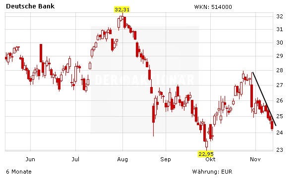 Die charttechnische Situation bei der Deutschen Bank verschlechtert sich weiter. Die kurzfristige Abwärtsbewegung ist voll intakt. Die Aktionäre werden wohl weiterhin eine Menge Geduld haben müssen mit der Deutschen Bank. Trader fahren besser mit der Commerzbank.