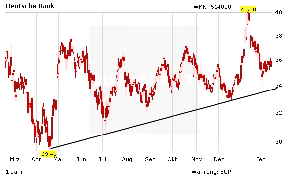 DER AKTIONÄR schlägt sich auf die Seite der Bullen. Während viele europäischen Konkurrenten KGVs von 14, 15 aufweisen, kommt die Aktie der Deutschen Bank auf ein 2014er-KGV von gerade mal 10. Geduldige Anleger steigen ein und setzen den Stopp bei 30,50 Euro.
