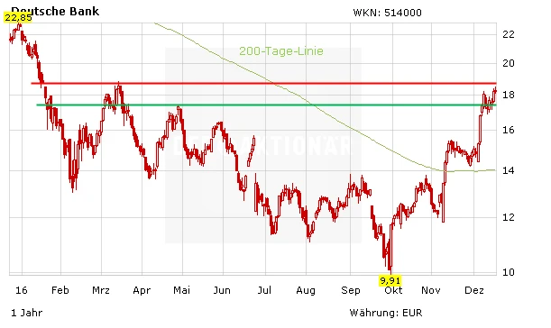 Die Einigung mit den USA rückt für die Deutsche Bank immer näher. Nach der 80%-Rallye ist eine scharfe Korrektur bei der Aktie jederzeit möglich. Trader können eine erste Position aufbauen und auf den Bruch des Widerstandes bei 18,50 Euro setzen. Im Bereich 17,50 Euro wird ein Stopp platziert. Konservative Anleger lassen dagegen die Finger von der Aktie.