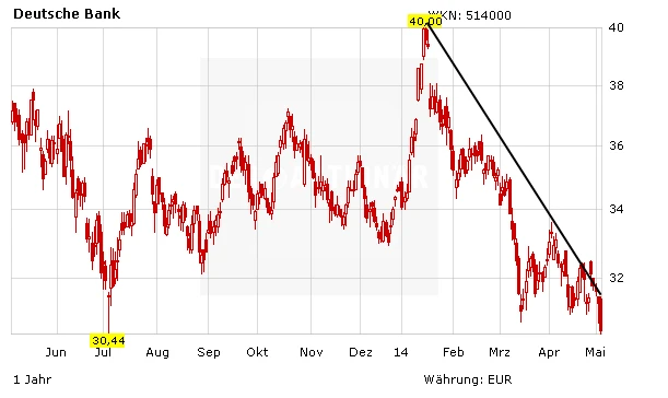 Am Morgen notiert die Aktie der Deutschen Bank bei 30,32 Euro und damit weiter unter dem Stoppkurs des AKTIONÄR bei 30,50 Euro. Nachrichten zum Unternehmen gibt es keine. Vielmehr belastet die allgemeine Marktschwäche den Aktienkurs der Deutschen Bank. Vor allem die instabile Situation in der Ukraine macht den Anlegern Sorgen. Börsenprofis wie Max Otte warnen vor einer Eskalation der Ereignisse in dem Land.