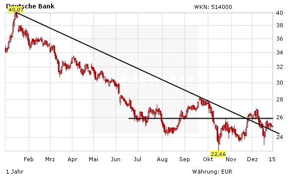 Die Aktie der Deutschen Bank hat ein rabenschwarzes Jahr hinter sich. Am Ende stand bei dem Titel ein Minus von 24,5 Prozent zu Buche. Nur die Adidas-Aktie entwickelte sich mit einem Verlust von 37,8 Prozent noch miserabler. Grund für die unterirdische Performance der Deutschen Bank waren vor allem zahlreiche teure Rechtsstreitigkeiten, die der Deutschen Bank zuletzt sogar rote Zahlen eingebracht haben.