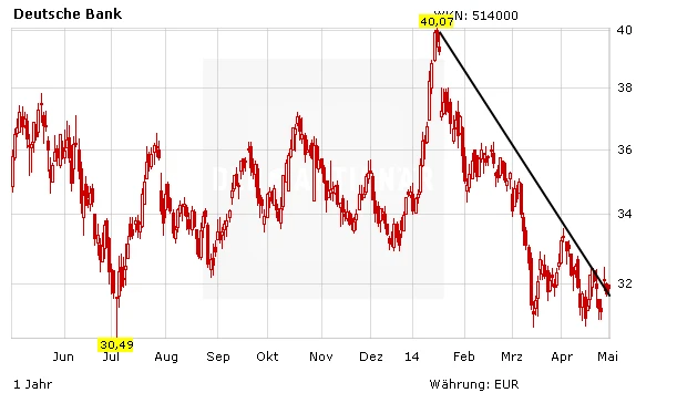 Aktionäre der Deutschen Bank benötigen viel Geduld. Neben den negativen Studien ist auch die charttechnische Lage nicht vielversprechend. Seit dem Hoch bei 40,07 Euro ist der Titel in einem steilen Abwärtstrend gefangen. Erst wenn der Kurs nachhaltig aus diesem ausbricht, ist wieder Besserung in Sicht.