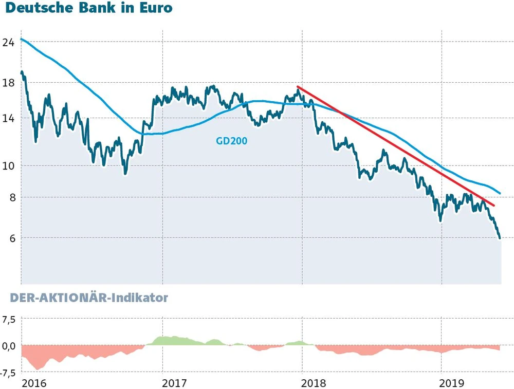 Die Deutsche Bank fällt fast täglich auf neue Tiefstkurse. Im gestrigen Handel tauchte das Papier bis auf 5,80 Euro ab, nur um dann bei 5,98 Euro zu schließen. Mittlerweile notiert die Aktie wieder knapp über der 6-Euro-Marke und damit fast unter allen Analystenzielen.