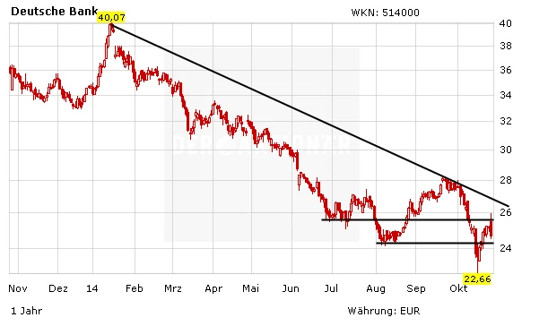 Am Mittwoch legt die Deutsche Bank die Zahlen für das dritte Quartal vor. Für diesen Zeitraum dürfte das Geldhaus die Rückstellungen für Rechtsrisiken von bislang 2,2 Milliarden auf ungefähr drei Milliarden Euro aufstocken. Beim Konzernumbau dürfte der Vorstand Fitschen/Jain weiter gut vorankommen. DER AKTIONÄR bleibt bei seiner positiven Einschätzung für die sehr günstig bewertete Aktie (2015er-KGV: 8). Der faire Wert liegt bei 35 Euro, der Stoppkurs sollte bei 22,50 Euro gesetzt werden.