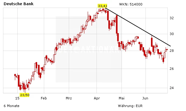 Wie es mit dem Aktienkurs nicht nur der Deutschen Bank, sondern mit dem gesamten Markt weitergeht, wird sich heute Abend entscheiden. Um 19 Uhr treffen sich die Euro-Finanzminister in Brüssel mit dem Ziel, sich auf ein Spar- und Reformpaket für Griechenland zu einigen. Die Reformzusagen sind Voraussetzung für die Auszahlung neuer Milliardenhilfen an das pleitebedrohte Land. Sollte alles gut ausgehen und Griechenland in der Eurozone bleiben, wird sich die Aufwärtsbewegung am Aktienmarkt aller Wahrscheinlichkeit nachhaltig fortsetzen. Dann könnte sich die Deutsche-Bank-Aktie in den kommenden Monaten ihrem fairen Wert von 40 Euro annähern. Der Stopp sollte bei 24,50 Euro gesetzt werden.