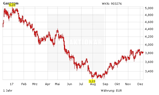 Auch DER AKTIONÄR ist für die Gazprom-Titel weiterhin zuversichtlich gestimmt. Mutige Anleger können bei der mit einem KGV von 4, einem KBV von 0,25 und einer Dividendenrendite von 6,2 Prozent noch sehr günstig bewerteten Aktie nach wie vor zugreifen, der Stopp sollte bei 2,90 Euro belassen werden.