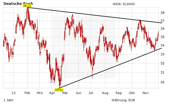 Die Aktie der Deutschen Bank steht derzeit im Fokus der Anleger. Der Titel hat Fahrt aufgenommen und nähert sich langsam dem Bereich von 36,50 Euro. Steigt die Aktie nachhaltig über diese Marke, würde sie aus der Keilformation und aus dem langfristigen Abwärtstrend ausbrechen. Das würde ein klares Kaufsignal bedeuten. Aus fundamentaler Sicht sind merklich höhere Kurse gerechtfertigt. Allerdings wird es wohl eine Zeitlang dauern, bis die komplette Unterbewertung der Aktie abgebaut ist. DER AKTIONÄR bleibt bei seinem Kursziel von 47 Euro, der Stopp sollte bei 29 Euro gesetzt werden.