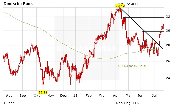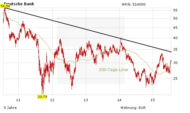 Nachdem auch das Griechenland-Thema voerst wieder vom Tisch ist, kann sich der Markt auf die fundamentalen Daten beim deutschen Marktführer konzentrieren. Und die sehen gut aus. Das KGV für 2016 beträgt gerade mal 11, das KBV 0,5. Damit ist die Aktie im Branchenvergleich alles andere als teuer. Für Kursfantasie sorgt zudem die Personalie John Cryan. Die Chancen stehen gut, dass der neue Chef der Deutschen Bank den Konzern umkrempeln und fit für die Zukunft machen wird, nach dem Motto: schlanker, flexibler, effizienter. Die guten Zahlen von Morgan Stanley machen zudem Hoffnung, dass auch das Investmentbanking bei der Deutschen Bank gut läuft. DER AKTIONÄR sieht den fairen Wert bei 40 Euro, der Stopp sollte bei 24,50 Euro gesetzt werden.