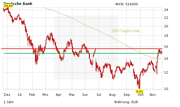 Die Aktie der Deutschen Bank konnte sich durch die besseren Aussichten für die Branche nach der Wahl von Trump etwas stabilisieren. Mit der Nominierung von Achleitner ist eine zweite Amtszeit so gut wie sicher, was kurzfristig für etwas Ruhe sorgen dürfte. Die Liste der Rechtsrisiken bei dem Konzern ist allerdings lang, eine Einigung in den USA wird erst Anfang 2017 erwartet. Trader können darauf setzen, dass die 15-Euro-Marke hält und der Widerstand bei 15,90 Euro geknackt wird. Alle anderen lassen die Finger von den Papieren.