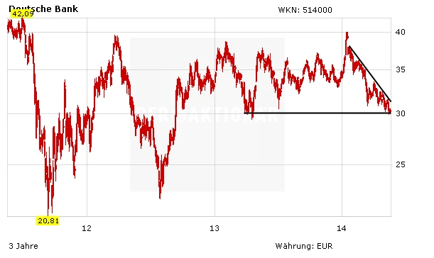 Nachdem die Aktie der Deutschen Bank unter den Stoppkurs des AKTIONÄR gerutscht ist, sollten Anleger zunächst abwarten. Durch die anstehende Kapitalerhöhung dürfte der Aktienkrus in den kommenden Wochen unter Druck bleiben. Fällt dabei die charttechnisch wichtige 30-Euro-Marke, könnte es rasch bergab gehen. Im Zuge einer Bodenbildung haben Anleger dann anschließend womöglich die Chance, noch günstiger bei Deutschlands Branchenprimus einzusteigen.