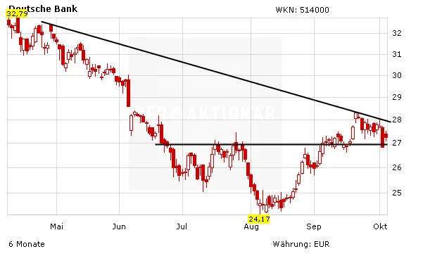 Die Deutsche Bank wird am 29. Oktober ihre Zahlen zum dritten Geschäftsquartal vorlegen. Nach einem Reuters-Bericht hatte die Nummer 1 unter den deutschen Geldhäusern ein starkes drittes Quartal. Wie die Nachrichtenagentur weiter meldete, will die Bank bis Jahresende einige ihrer größten Rechtsstreitigkeiten beilegen.
