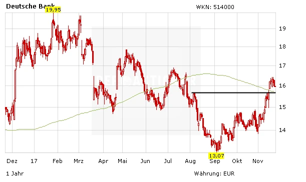 Die Aktie der Deutschen Bank konnte die Marke von 16,00 Euro gestern nicht halten. Charttechnisch ist deswegen aber noch nichts angebrannt: Die nächste Unterstützungszone liegt im Bereich von 15,80 Euro. Zudem ist die 200-Tage-Linie noch ein Stück entfernt. Fundamental sind die Anteilscheine mit einem KGV von 11 und einem Kurs-Buchwert-Verhältnis von 0,5 immer noch unterbewertet. DER AKTIONÄR rät deshalb zum Kauf und hat ein Kursziel von 20,00 Euro. Der Stopp wird auf 14,50 Euro nachgezogen