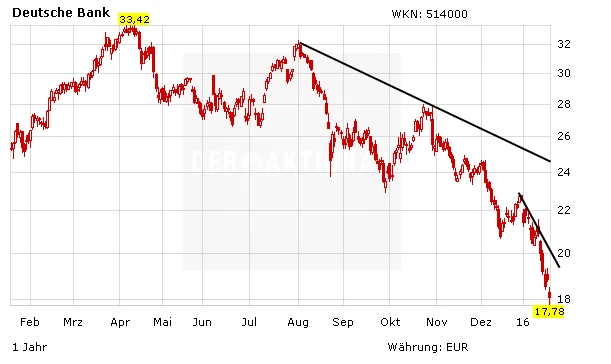 Die Aktie der Deutschen Bank verliert am Mittwoch in der Spitze fünf Prozent und fällt zum ersten Mal seit Anfang März 2009 wieder unter 18 Euro. Damals hielt die Finanzkrise die Märkte in Atem. Nun treibt der freie Fall der Ölpreise die Anleger aus risikoreichen Anlagen. Alleine seit Jahresbeginn steht in den Papieren des deutschen Branchenführers ein Minus von mehr als 20 Prozent zu Buche.