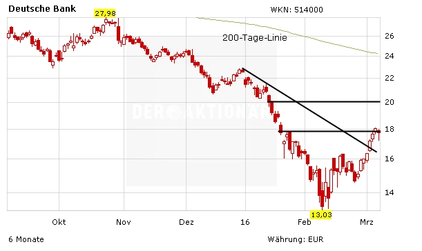 Die Aktie der Deutschen Bank verliert im frühen Dienstaghandel 1,3 Prozent auf 17,51 Euro. Damit entfernt sich der Titel weiter von der bedeutenden Widerstandsmarke bei 18 Euro. Wichtig ist, dass der Abwärtstrend, der aktuell bei 16,40 Euro verläuft, nicht nach unten durchbrochen wird. Sonst könnte es schnell Richtung 15 Euro abwärts gehen.