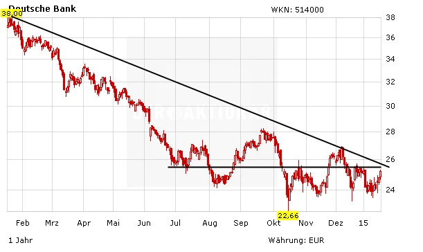 Die Deutsche-Bank-Aktie liegt am Montag mit zwei Prozent im Plus bei 25,21 Euro. Für Rückenwind sorgt die Kaufempfehlung von Natixis. Analyst Steven Gould sieht das Kursziel bei 30 Euro. DER AKTIONÄR sieht das Kursziel bei 33 Euro. Während viele europäischen Bank-Aktien schon gut gelaufen sind, hat die Deutsche Bank noch Kursfantasie. Ein Grund hierfür: die neue Strategie, die die Deutsche Bank im zweiten Quartal veröffentlichen wird. Hier darf man vor allem gespannt sein, wo und wie viel der Vorstand Fitschen/Jain einsparen will. Wahrscheinlich wird es zu weiteren Filialschließungen kommen. Eine Anklage gegen Fitschen sollte den Kurs nicht weiter belasten. Spekulativ orientierte Anleger, die auf die Wende zum Guten setzen wollen, setzen den Stopp bei 21,50 Euro.