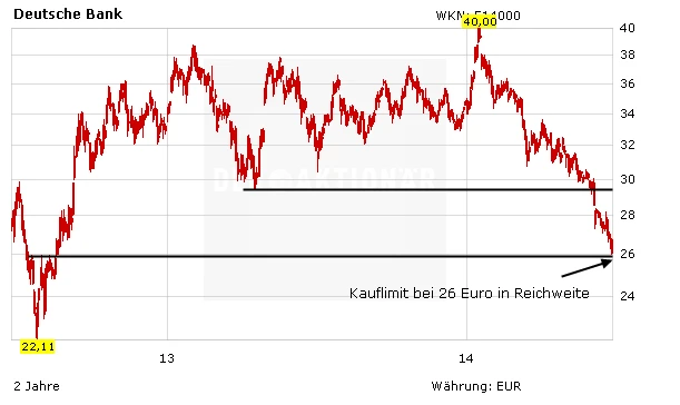 Die Aktie der Deutschen Bank zählt mit einem 2015er-KGV von 9 zu den günstigsten Finanztiteln weltweit. Die meisten Probleme und Risiken sollten im Aktienkurs eingepreist sein, so dass der Kurseinbruch – aus fundamentaler Sicht – längst übertrieben ist. Solange sich das Chartbild nicht ändert, sollten Anleger an der Seitenlinie verharren. Das Abstauberlimit von 26 Euro hat weiterhin Gültigkeit.